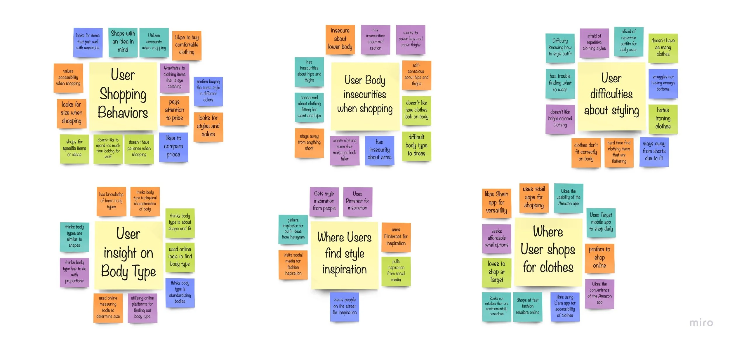 I organized interview insights into Affinity Maps, grouping responses into key categories: shopping behaviors, body insecurities, styling challenges, body type awareness, and preferred shopping destinations.
